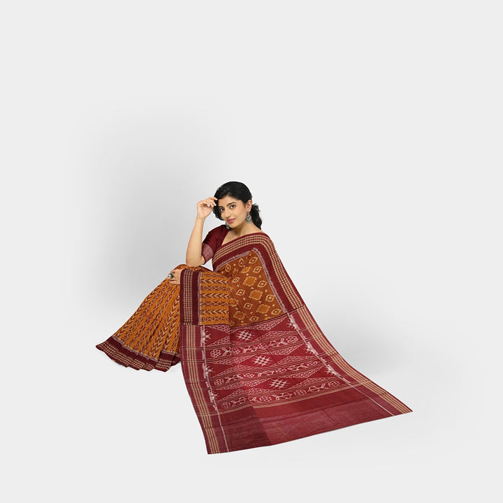 Sambalpuri sarees are renowned for their traditional handwoven ikat technique, where both the warp and weft are tie-dyed before weaving. This elegant Sambalpuri cotton saree is a testament to Odisha's rich cultural heritage, offering unmatched comfort and timeless beauty.