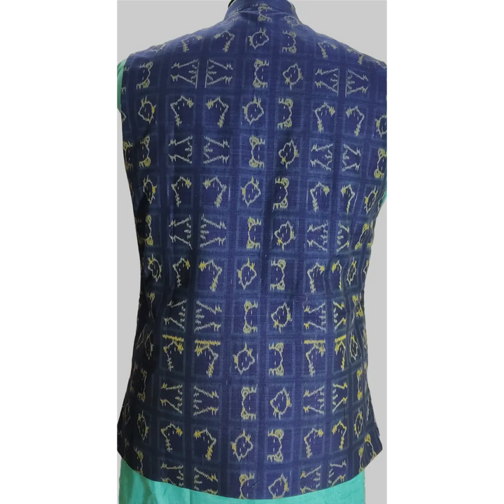 Embrace tradition with this authentic Sambalpuri Modi Jacket, handwoven from premium cotton using the Ikat weaving technique. The jacket features intricate patterns and vibrant, eco-friendly colors, making it the perfect blend of comfort and style.